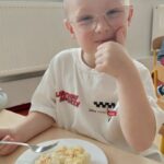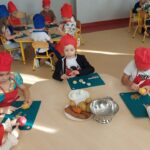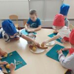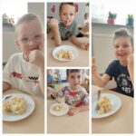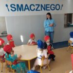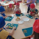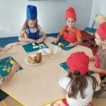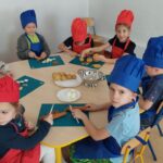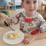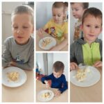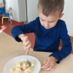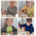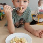 Po części matematycznej przyszedł czas na działanie praktyczne – każde dziecko mogło samodzielnie obrać, pokroić i przygotować swoje składniki. Z wielkim zaangażowaniem odmierzali porcje, dodawali przyprawy i mieszali wszystkie składniki w dużej misce. Zajęcia zakończyły się degustacją własnoręcznie przygotowanej sałatki. Dzieci z dumą opowiadały, co dodały do swojej porcji i ile kawałków jabłka lub plasterków marchewki udało im się policzyć.