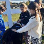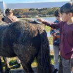 Dzieci aktywnie uczestniczyły w zajęciach praktycznych – dokarmiały konie, głaskały i czesały ich grzywy, poznając przy tym zasady bezpiecznego zachowania w ich otoczeniu. Karmiły również alpaki i owce, które szybko zyskały sympatię wszystkich uczestników. Dużo radości sprawił też kontakt z mniejszymi mieszkańcami zagrody – kotami, kurami i świnką morską, które chętnie pozwalały się głaskać i obserwować.
